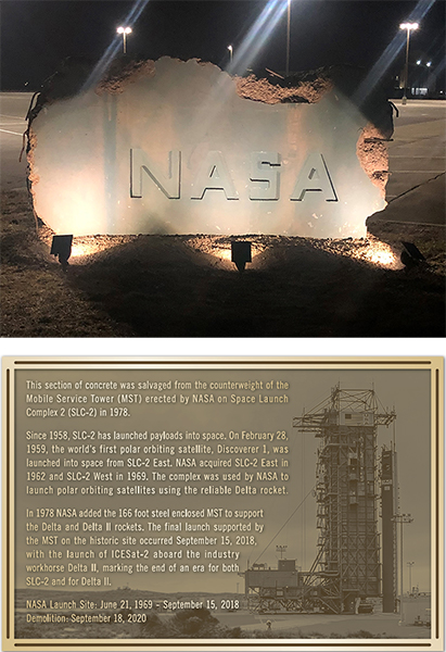To pay tribute to the men and women who worked at SLC-2, a.i. solutions preserved the concrete NASA sign displayed in front of the NASA operations center at Vandenberg (Building 836) with a historical plaque.